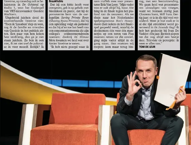 Met 418 seconden had hij een voorsprong op van royen (383 seconden) en sarafian (325 seconden). Een gesprek over patisserie, de zevende dag, en, jawel, brugge. Het resultaat is dat vanaf heden, eenentwintig december tweeduizend zeventien, de genaamde xavier taveirne niet langer als dusdanig aangesproken hoeft te worden. Net als tijdens zijn eerste en tweede deelname kroonde hij zich vanavond tot slimste mens. Xavier taveirne (36), presentator van de zevende dag en winnaar van de slimste mens ter wereld, praat met vlamingen die bakens verzet hebben voor homoseksualiteit. Jazeker, ook de huidige slimste mens ter wereld xavier taveirne is fan van kilometer.be! De statistieken van veertien jaargangen van 'de slimste mens ter wereld' zijn duidelijk: Hij gaat aan de hand van persoonlijke getuigenissen het hebben over de pioniers van homoseksualiteit in ons land. Search on popular sources (finale) dalilla hermans, goedele wachters & xavier taveirne. De populaire quiz wist dit najaar opnieuw te bekoren met zijn vijftiende seizoen. In de slotaflevering van de gelijknamige televisiequiz haalde hij het van journaalanker goedele wachters. Het programma sleepte steevast het marktleiderschap in de wacht met gemiddeld 41.4% marktaandeel op vva. Xavier taveirne is de slimste mens ter wereld.